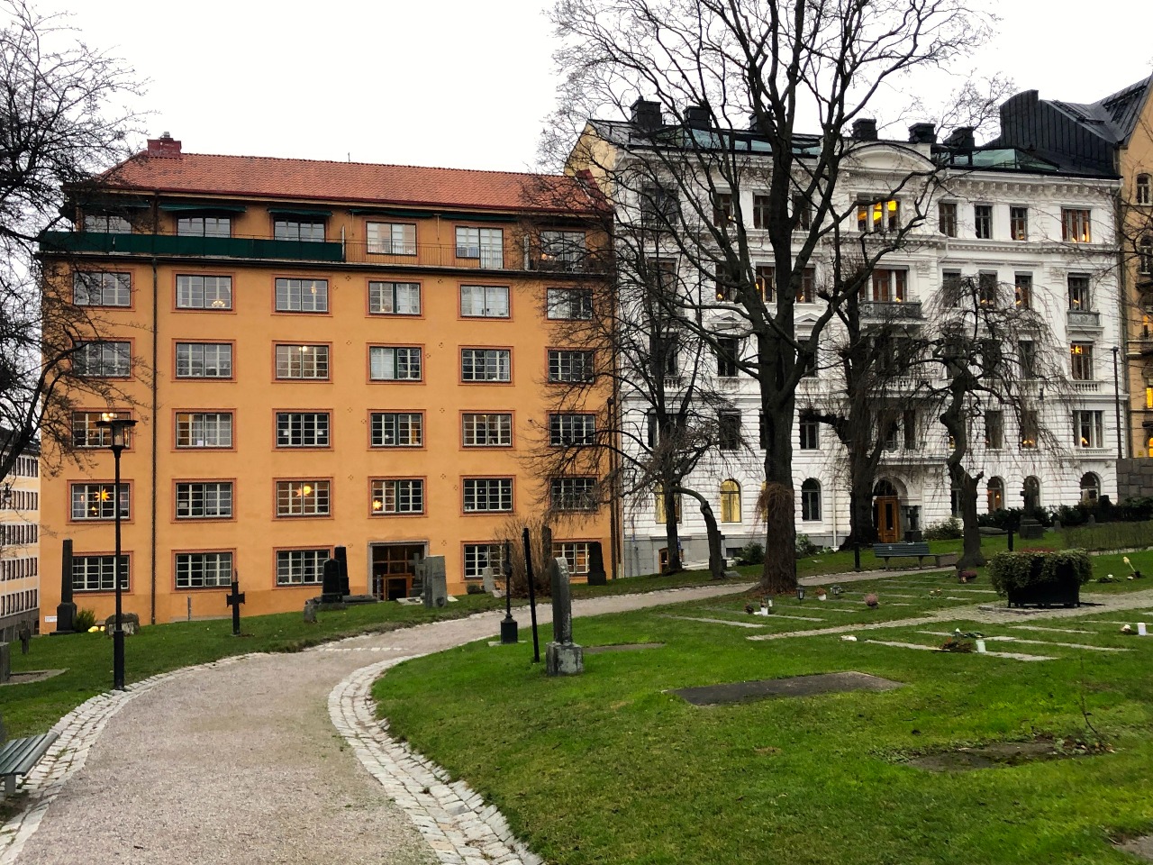 Vi traskade på via Vanadislunden och delar av det s k Sibirien till ett bostadshus på Kammakargatan vid Johannes kyrka med för CJ karaktäristiska breda fönster och kraftiga omfattningar. På vägen kunde noteras att gruppen, som med god marginal överskrider de rekommenderade antalet åtta, inte riktigt tagit in vad att hålla avstånd innebär. Se foto nedan!