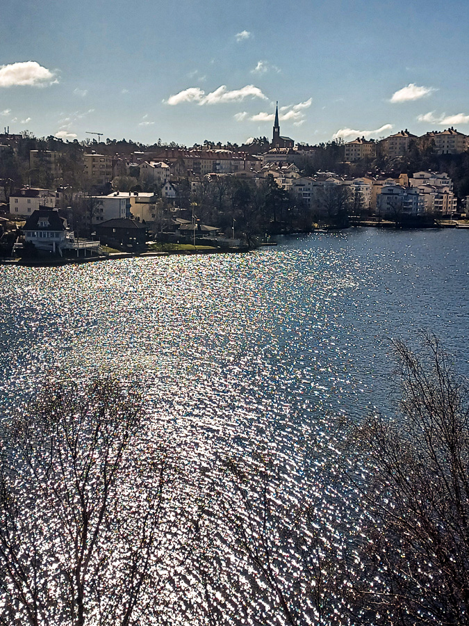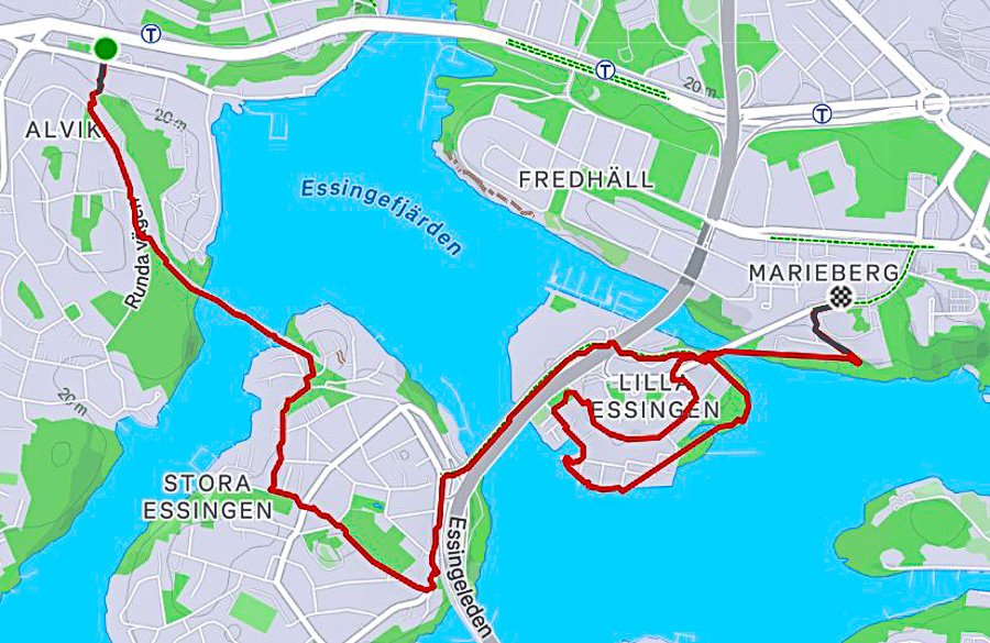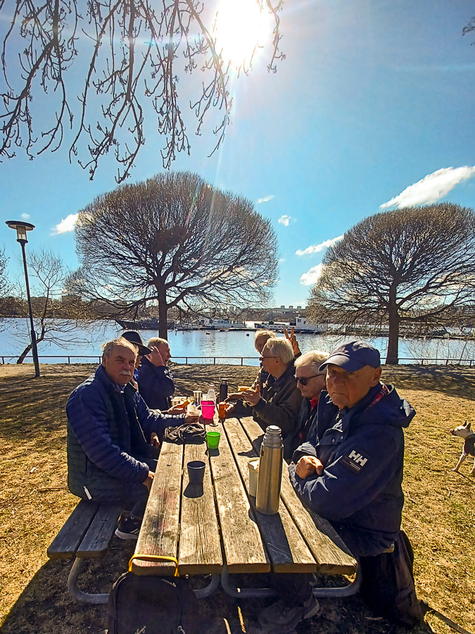 Spårvägsbron mot Stora Essingen avverkades i god takt och ön med dess trivsamma bebyggelse avnjöts och sevärdheter som torget mitt på ön och Cyrillus Johanssons kyrka undveks med framgång. Över till Lilla Essingen på en av dagens otaliga broar och kaffe med Chrilles filoinbakade fetaost avnjöts på öns sydkust i strålande sol. Denna kust avverkades sedan i ostlig riktning och vi kunde notera att Electrolux gamla fabriksområde numera huserade bostäder för många lyckliga bostadsrättsföreningslägenhetsinnehavare (dagens längsta ord…).