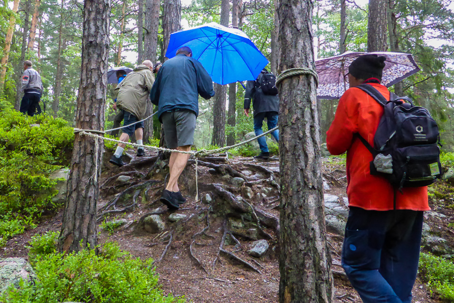 Allt annat än brukligt onsdagsvandringsväder mötte oss vid samlingen till säsongsavslutningen vid Fisksätra station. Tunga moln och ett lätt regn kunde det förväntansfulla och talrika gänget notera. Olle och Hasse, dagens guider, ledde oss genom Fisksätra centrum in bland svindlande, backiga och stundtals rotrika stigar i traktens vildvuxna skogar.