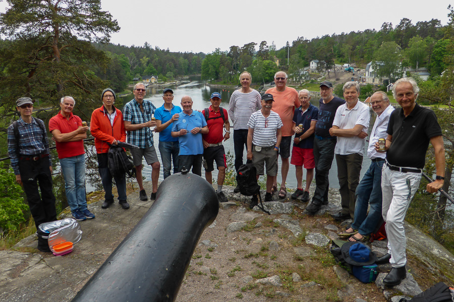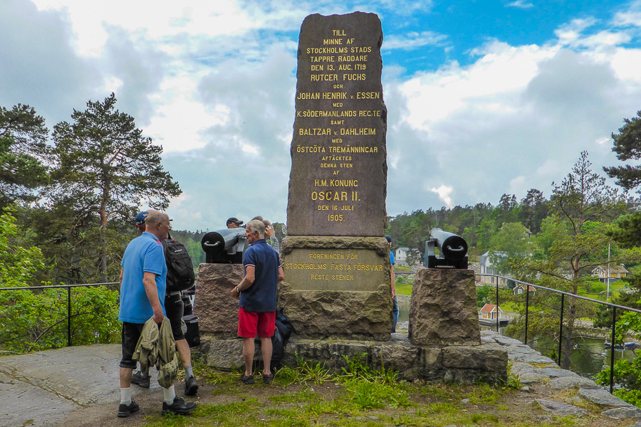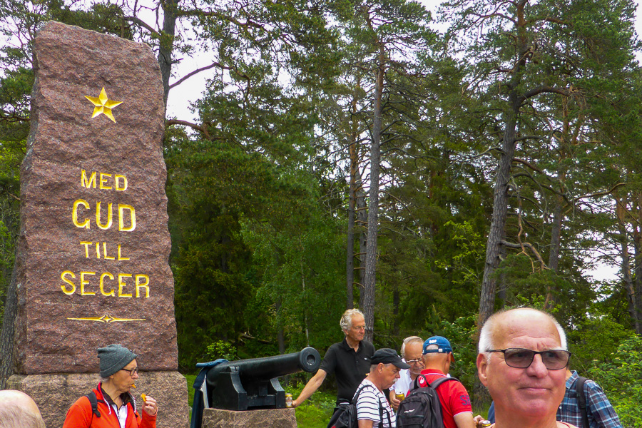 Så småningom kunde vi skönja Baggensfjärdens vida vatten österut. Ola bidrog med historier om ett tidigare majestäts tennisspel och snedsteg av annat slag i trakten. Vandringen gick vidare mot monumentet till minne av den framgångsrika bataljen mot ryssen 1719 som stoppades vid Baggensstäket efter heroiska insatser av de svenska soldaterna. Hasse och Olle bjöd på delikata laxsnittar och parmesangodbitar tillsammans med öl av olika styrkor.