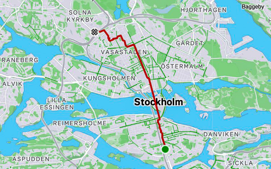 Strava-karta där t-bane-resa tillkommer som är c:a 2km. Strava mätte 4,19km promenad
