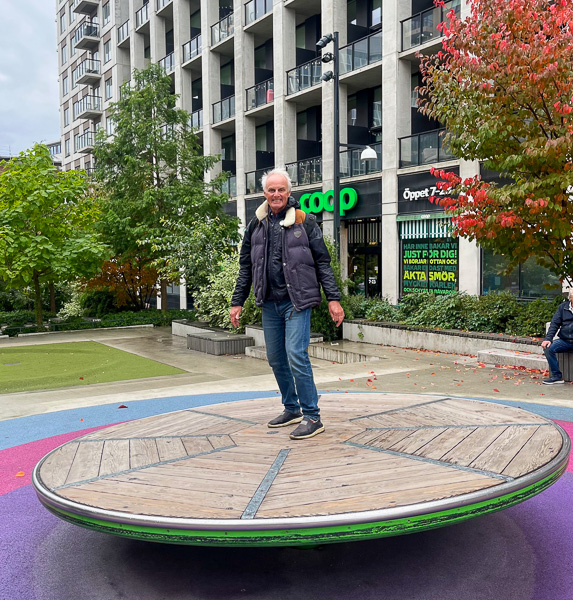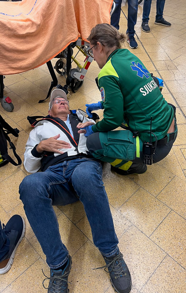 Vi vandrade genom Skanstulls station och vidare Götgatan norrut till Slussen där Jörn tappade medvetandet och försiktigt lades ned på perrongen, 112 kontaktades och ambulans kom och tog den då vakne om än omtumlade Jörn till St Görans sjukhus för observation.