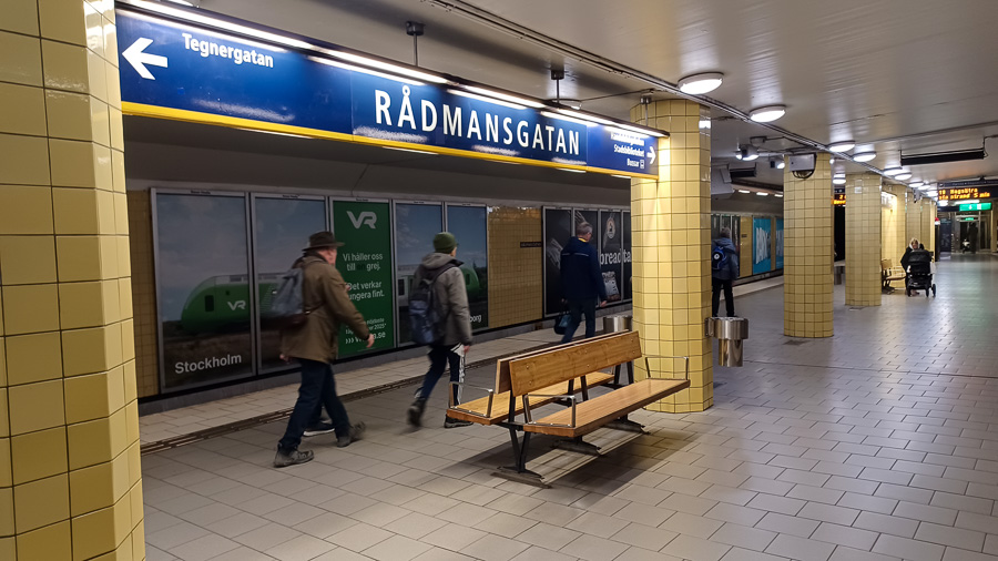 “Det började sjuda och knäppa i spåren på ena sidan av plattformen. Ett tåg nalkades söderifrån, från Kungsgatan. Bullret inifrån tunneln växte i styrka och plötsligt dök det gröna tågets två eldögon ut ur mörkret. Det rasslade och dånade och tåget stannade. Tågets automatiska dörrar gick upp med ett väsande ljud och folk strömmade in i och ut ur vagnarna”