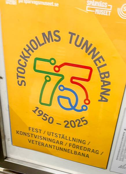 Den invigdes med kunglig närvaro den 1 oktober (!) 1950 och dess föregångare var en spårvagnslinje som redan 1933 gick mellan Skanstull och Slussen och som delvis gick i en tunnel och därför kallades “tunnelbanan”. 1952 startades gröna linjen ut till Vällingby. Sedan dess har t-banan växt i olika etapper , bl a röda linjen 1965 och blåa linjen 1975, för att nu omfatta 100 stationer och 106 km räls. Beslut har tagits att utöka den med 18 stationer och 30 km.